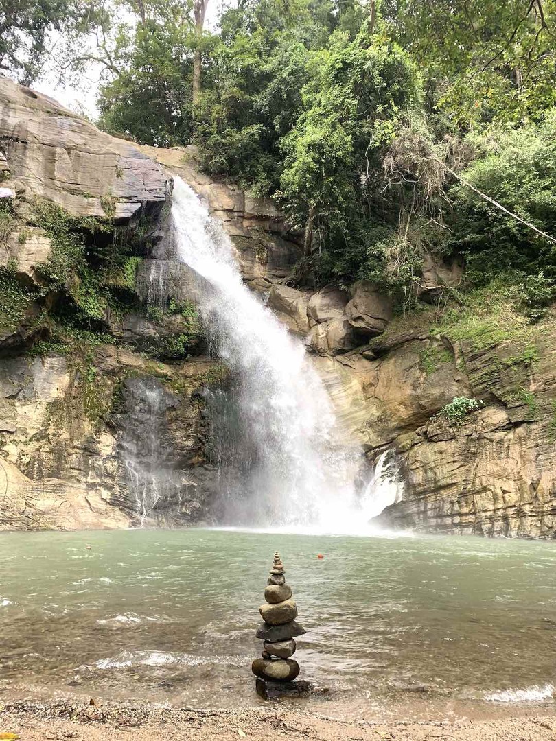 -J'emprunte la route secondaire qui me mène vers le centre du pays. Vers 13 h, il fait chaud et j'ai faim, je trouve une cascade en bord de route où me rafraîchir avec un bon petit restaurant local. Je partage la rivière avec une sympathique famille qui me pose mille questions. Le père veut que je marie sa fille... Mais j'ai de la route moi !