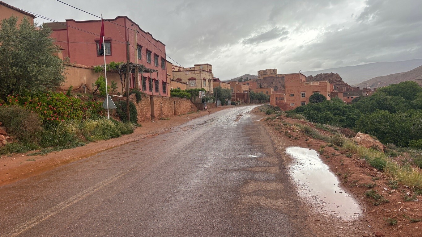 Un peu de pistes puis col récemment goudronné en 2019, alt. 2350 m. Orage en montagne, arrivée à Boulmane Dadès sous la pluie et descente dans les gorges par la piste. Arrivée dans les gorges. Après l’orage, la grêle.