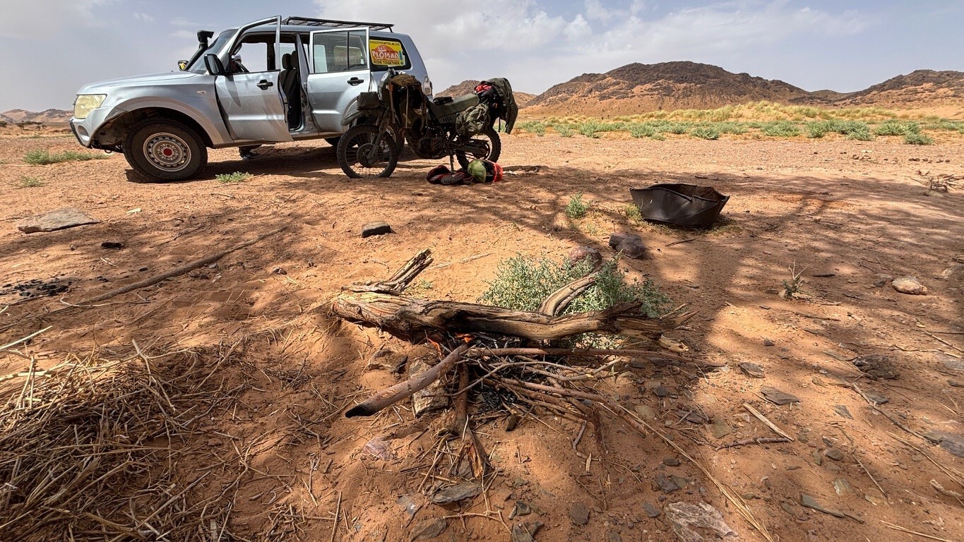 Rencontre avec le staff du Santana Trophy. Tempête de sable. Négociation d'essence en bouteille quand on retrouve le goudron. 9 km de goudron puis de nouveau la piste. On se fait doubler (déposer) par les gars du Sanraiders.
