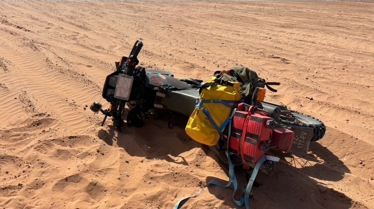 En roue libre… tuto de Tom Barrer… Ensuite, 8h de moto alternant pistes roulantes, pierriers et traversées d’oued de 200 m de large (que du sable).